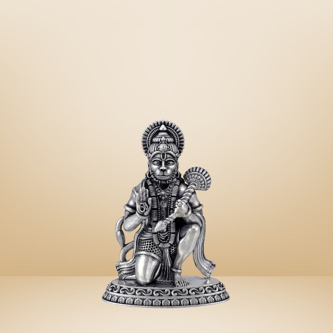 This stunning idol of Hanuman Ji, kneeling in devotion with royal adornments, symbolizes strength offered in surrender. With exquisite details from crown to gada, and handcrafted in 92.5 silver, it’s perfect for daily worship and a reminder of loyalty, courage, and divine humility.