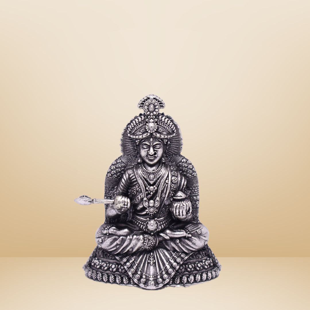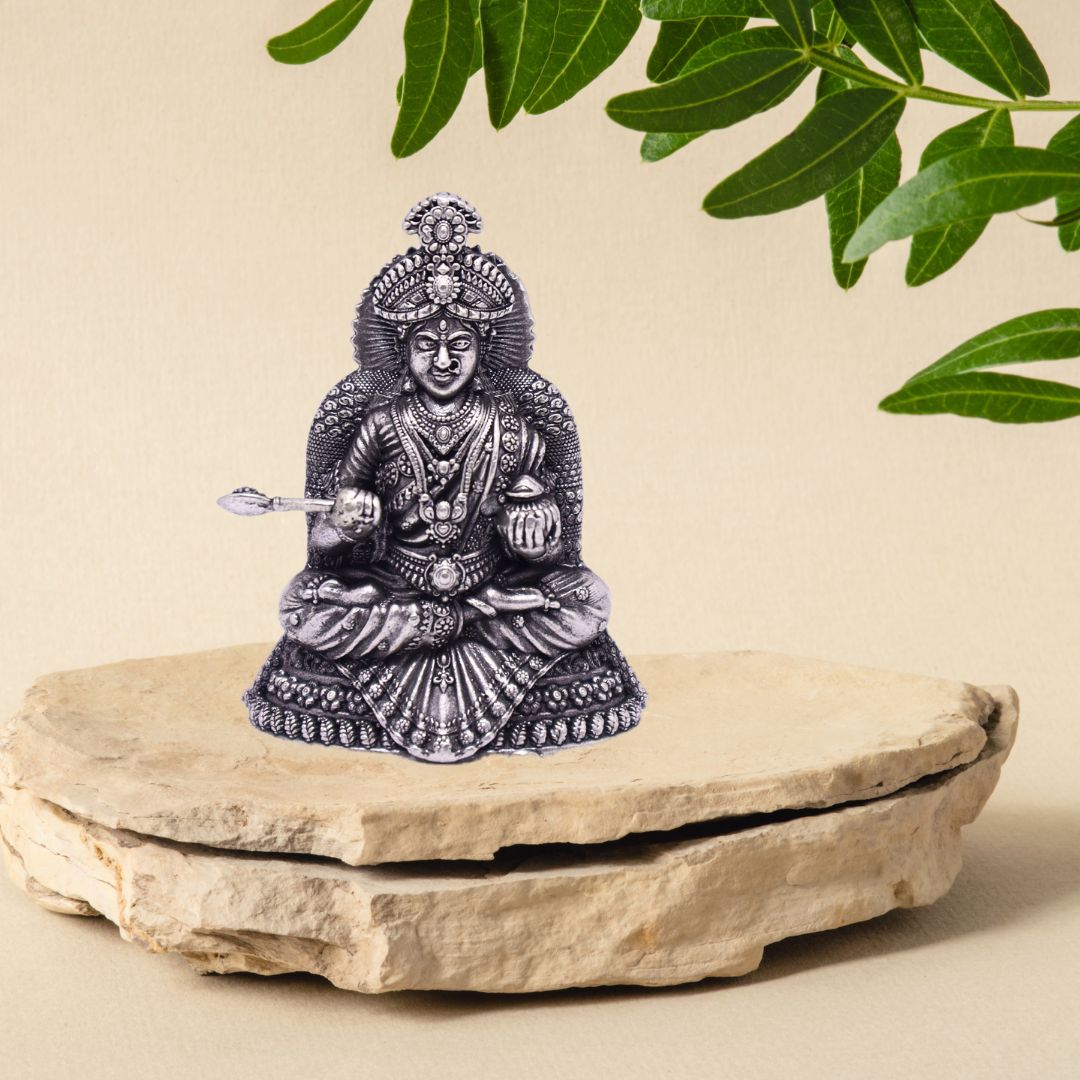 This radiant 925 silver idol of Annapurna Ji, seated with her ladle and bowl, blesses the home with nourishment, generosity, and divine grace. A revered figure during Annapurna Jayanti and Navratri, she is ideal for kitchens and pooja spaces devoted to gratitude and abundance.
