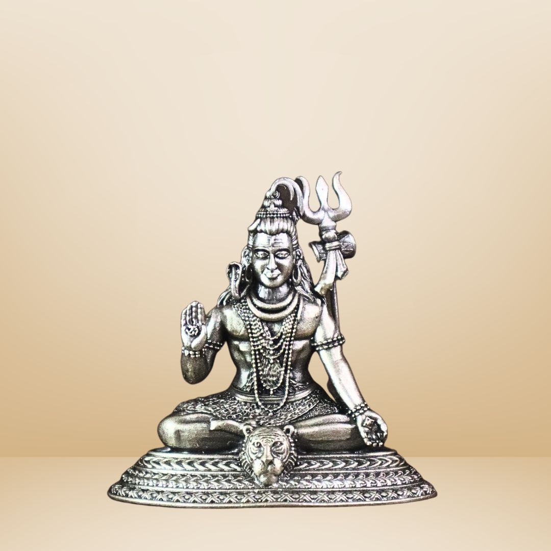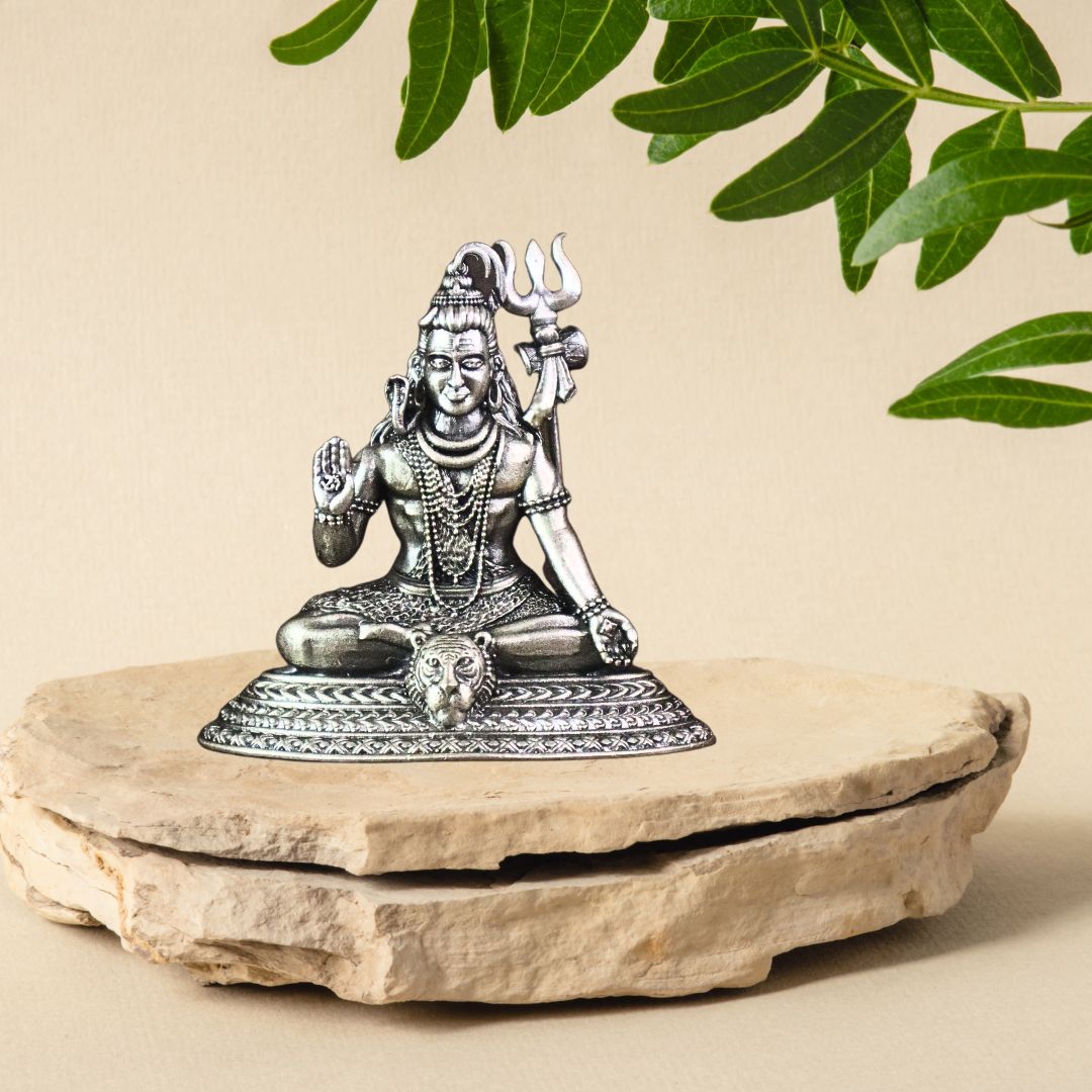 Invoke serenity and strength with this 92.5 silver idol of Lord Shiva in a meditative pose, holding his trident and seated upon a tiger skin. A timeless representation of peace and power, ideal for daily pooja, Rudrabhishek, or as a centerpiece for Maha Shivratri celebrations.