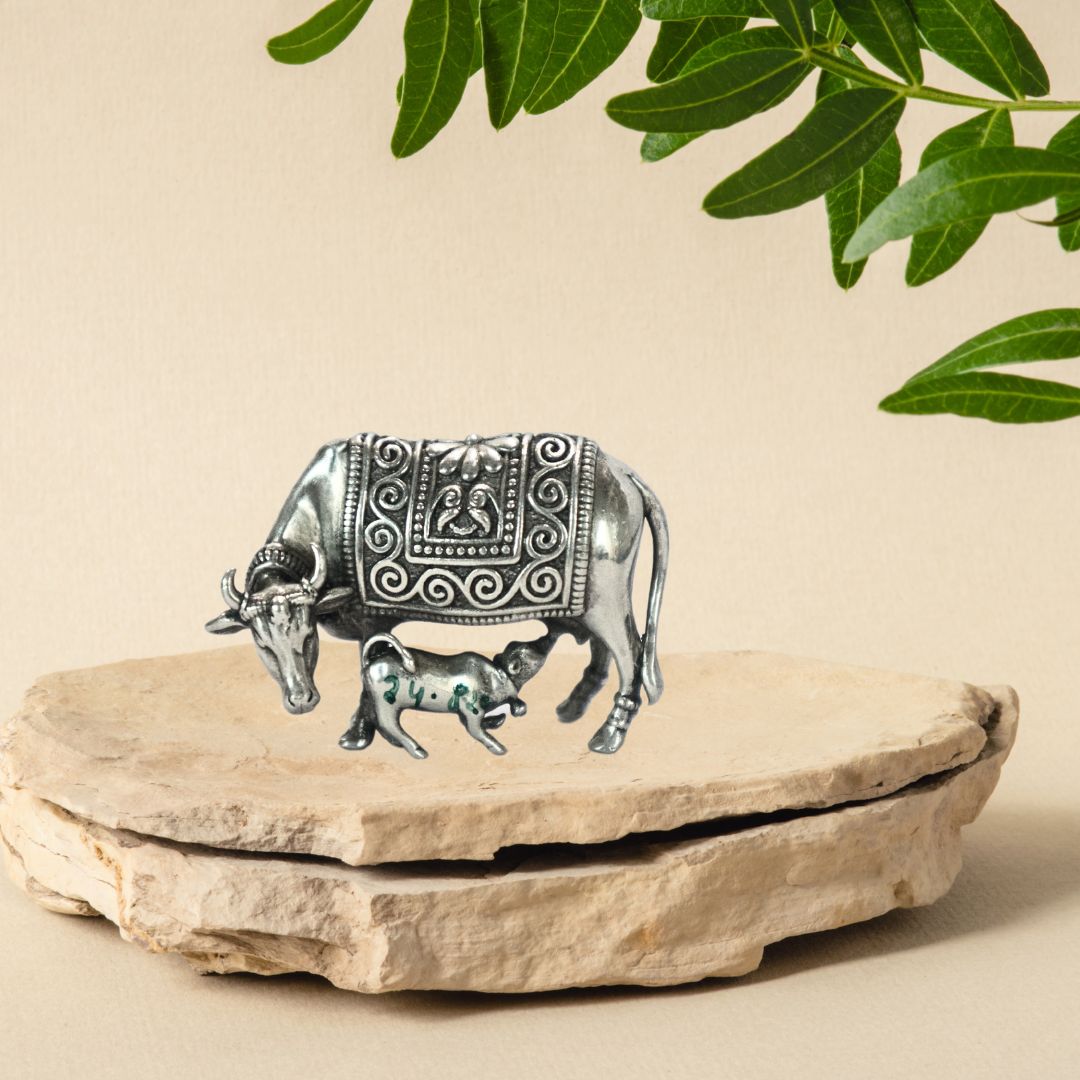 Inspired by Lord Krishna’s early years in Gokul, this handcrafted silver sculpture of a cow and calf celebrates purity, protection, and divine motherhood. Adorned with traditional motifs and sacred presence, it brings calm and completeness to any spiritual space.