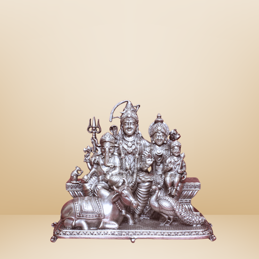 This intricate idol of the Shiva Parivar brings together Shiva, Parvati, Ganesha, Kartikeya, Nandi, and the peacock — embodying divine unity and familial blessings. Deeply cherished in Kannada culture, it holds special significance during Maha Shivaratri and Shravan Maas, making it an ideal centerpiece for your pooja room.