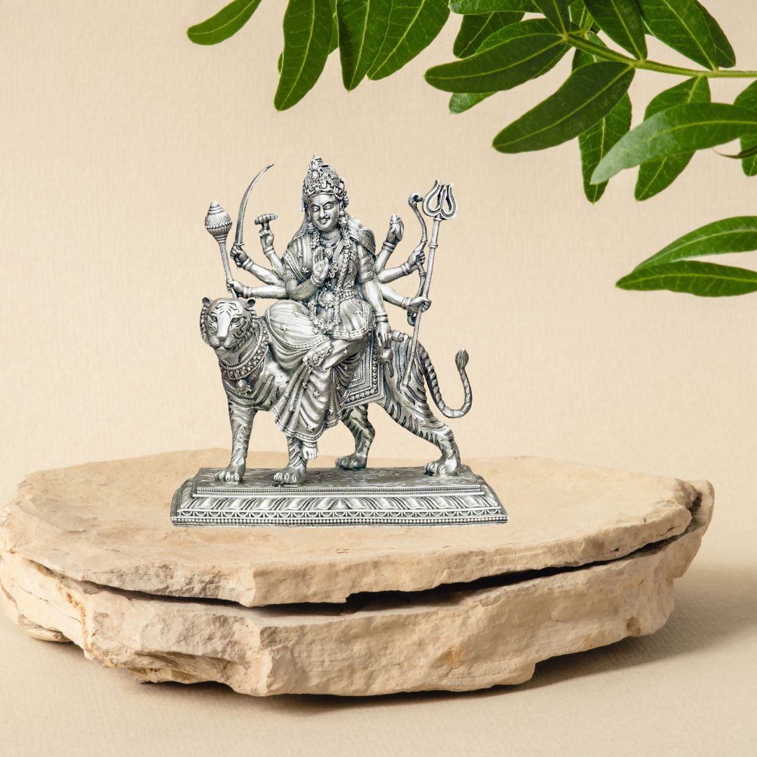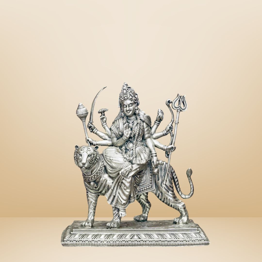 Crafted in solid 925 silver and detailed with precision, this idol of Durga Mata captures the divine energy of the goddess during Navaratri and Dasara festivities. Every element, from her expressive posture to the powerful weapons she holds, reflects unmatched artisan skill — making this a standout piece in your pooja space.