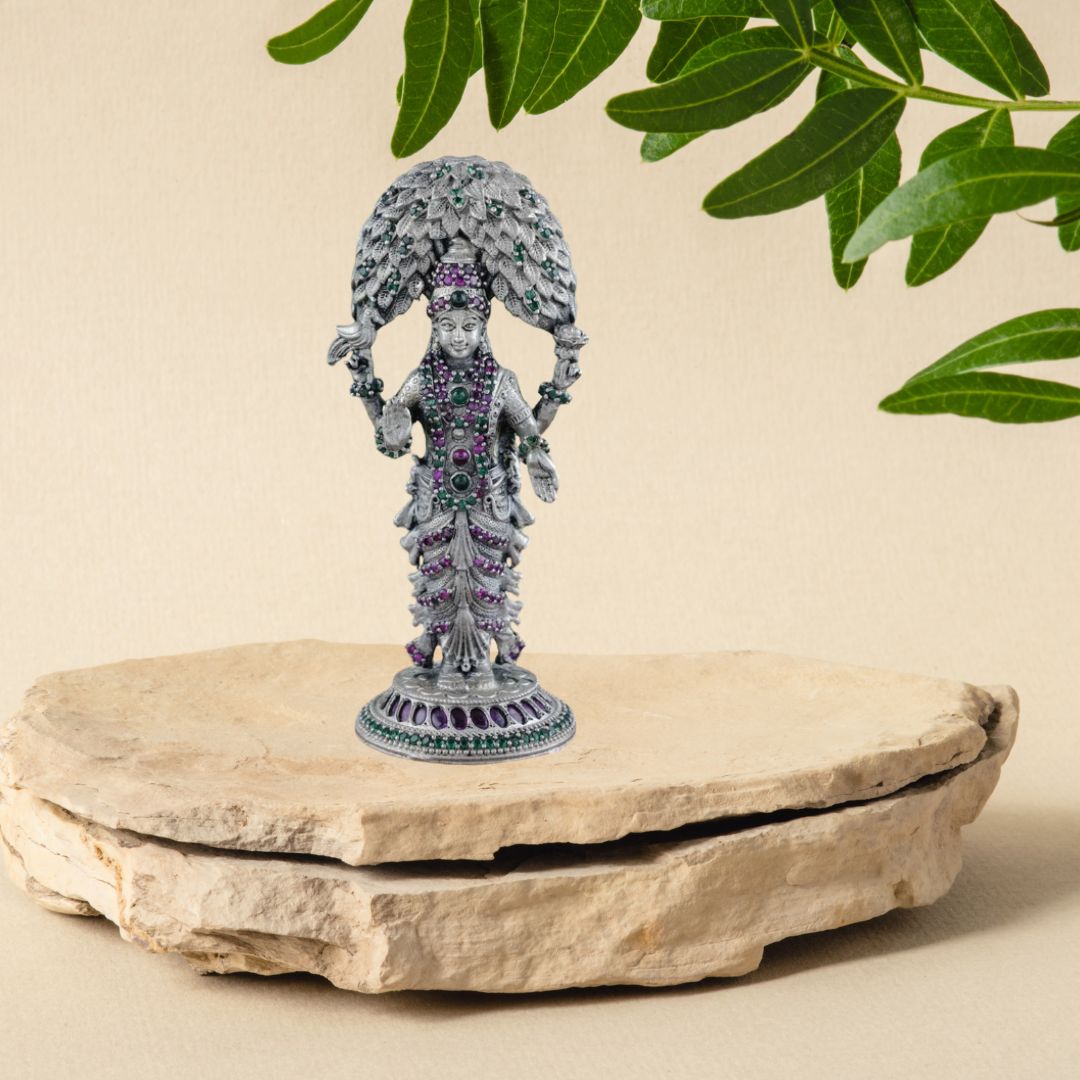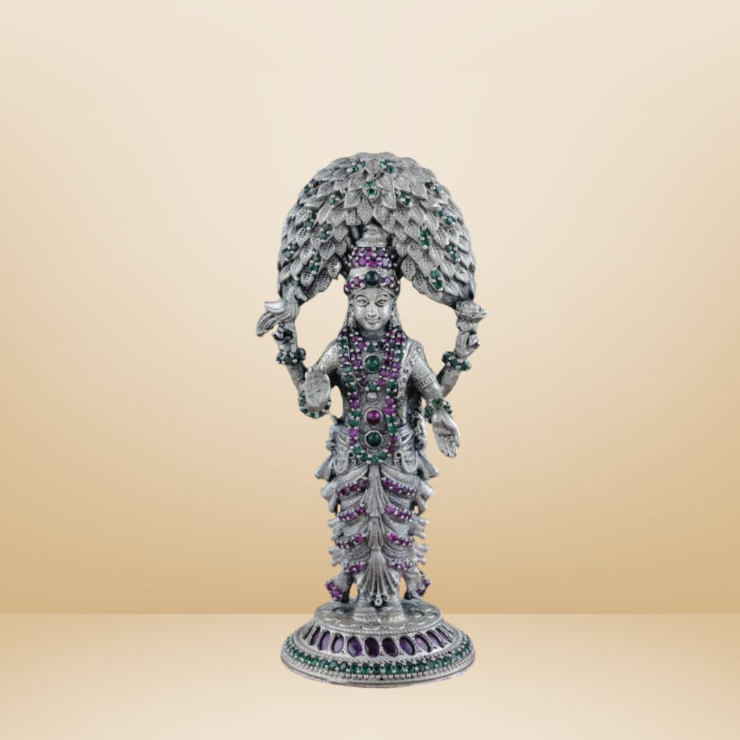 Adorned with intricate silverwork and gemstone detailing, this 925 silver idol of Vasavi Devi reflects serenity and divine strength. Widely worshipped during Vasavi Jayanti, her presence brings blessings of peace, sacrifice, and spiritual purity into the home — a treasured choice for South Indian traditions.