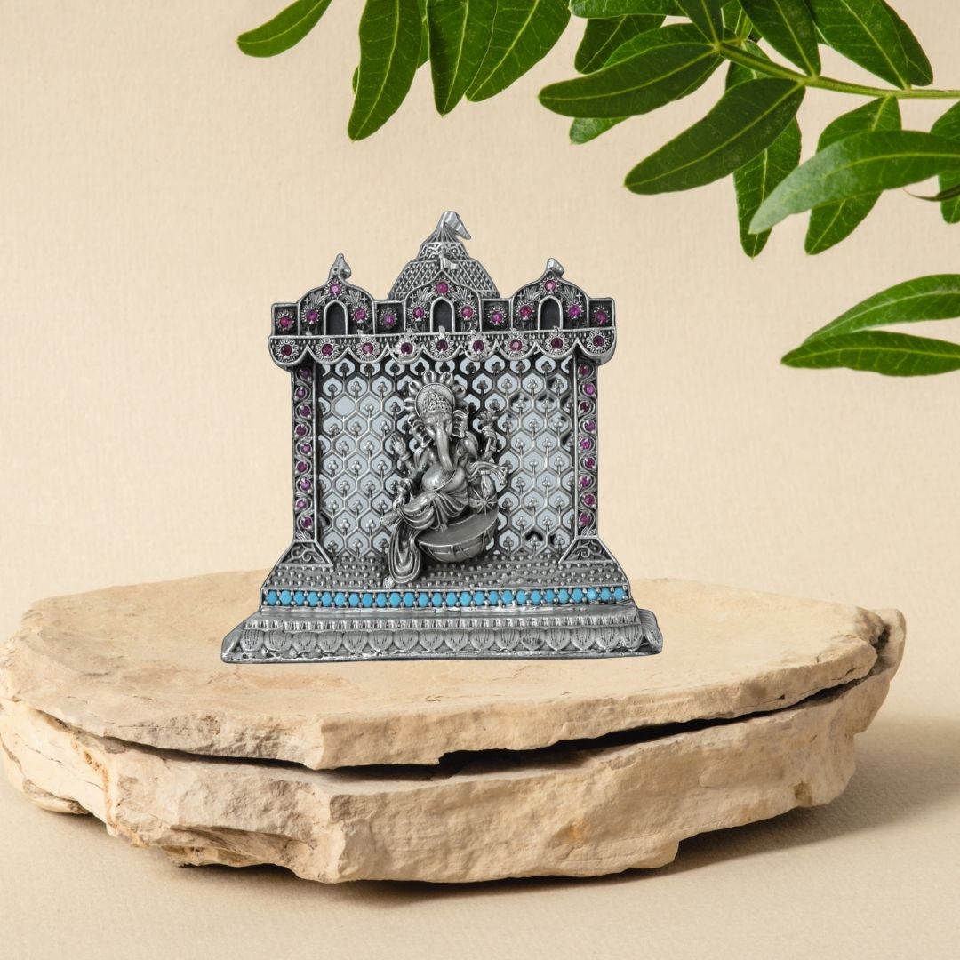 Intricately seated within a beautifully carved temple arch, this idol of Ganesh Ji radiates grace and grandeur. With gemstone detailing and timeless craftsmanship, it honors the remover of obstacles and invites wisdom, clarity, and prosperity into any sacred space.