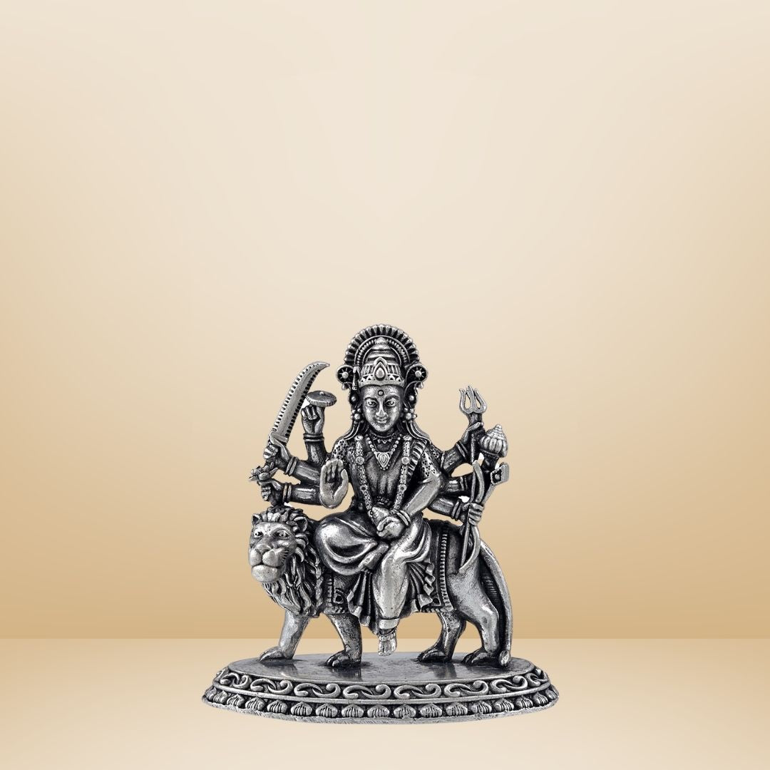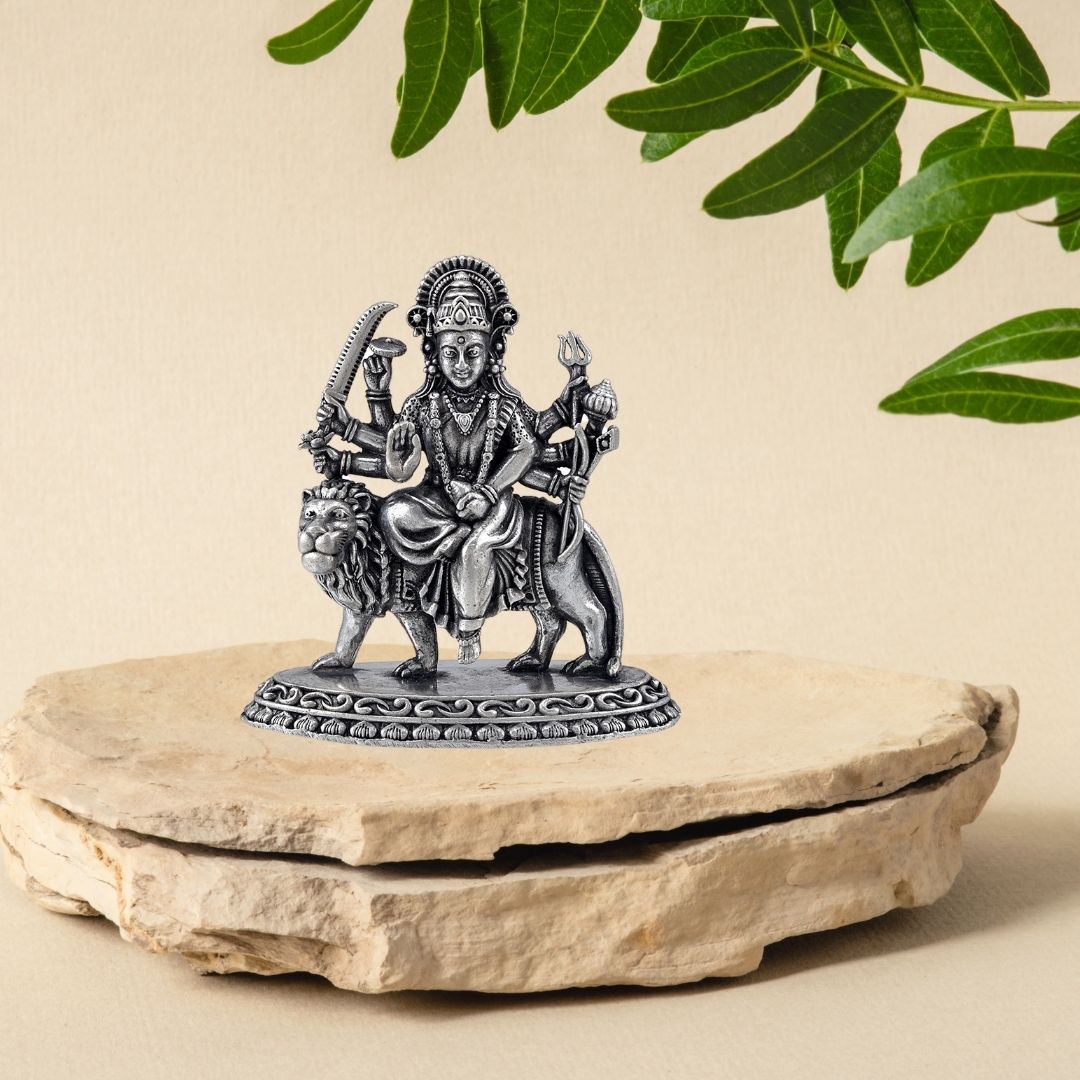 This intricately detailed silver idol of Goddess Durga, riding her lion and wielding her celestial weapons, embodies divine power and protection. A radiant centerpiece for Navratri pooja and Durga Ashtami, this idol brings blessings of courage, clarity, and triumph into your home.