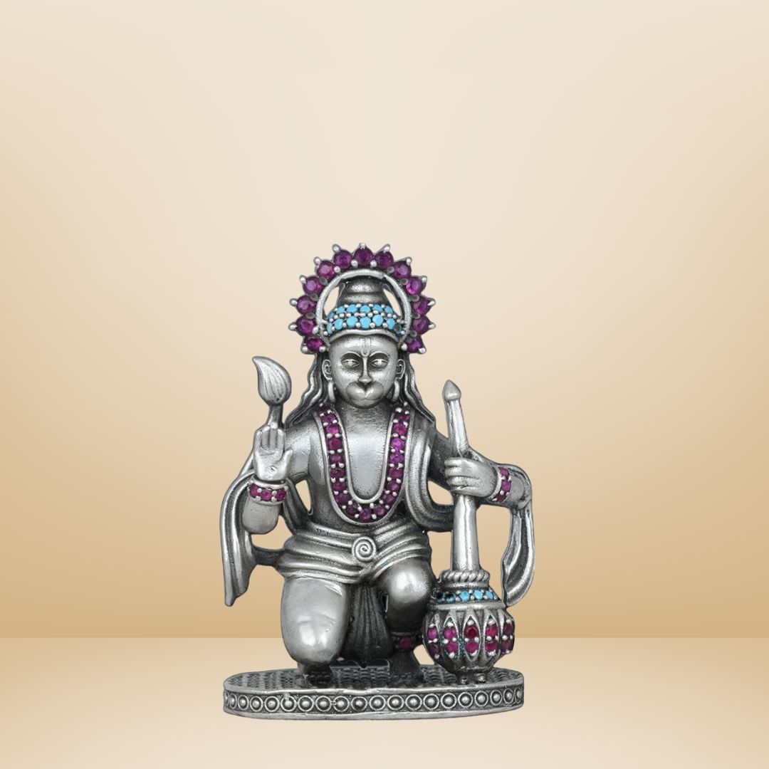 This serene idol of Hanuman Ji, kneeling in devotion with his right hand raised in blessing, is a timeless symbol of faith, courage, and service. With handcrafted silverwork and subtle gemstone accents, it's perfect for invoking strength and spiritual discipline in your daily pooja.