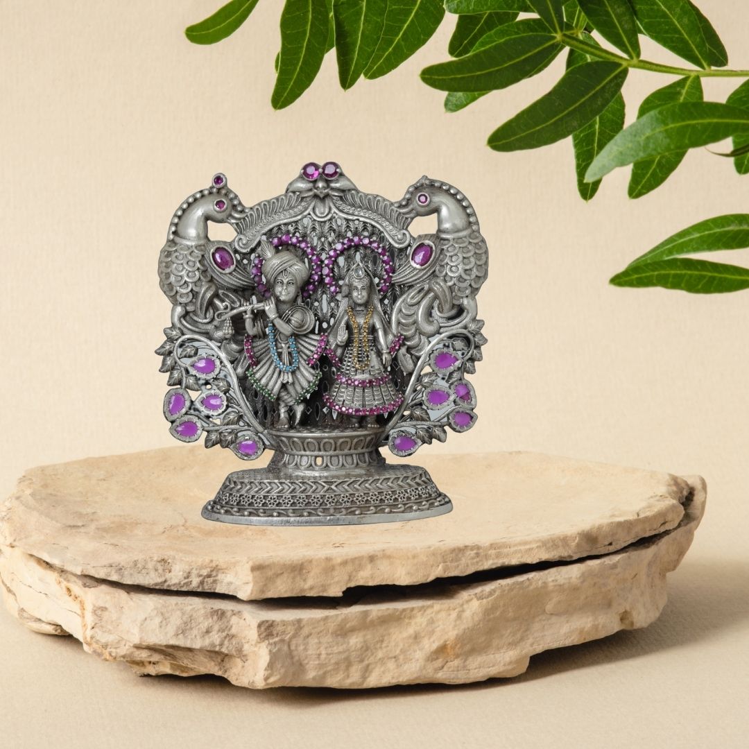 Celebrate the spirit of Janmashtami with this intricately designed 92.5 silver idol of Radha and Baal Krishna, adorned in vibrant colors and framed by twin peacocks. A tribute to Krishna’s childhood charm, this piece is perfect for festive décor and devotional offerings during Krishna Janmashtami.