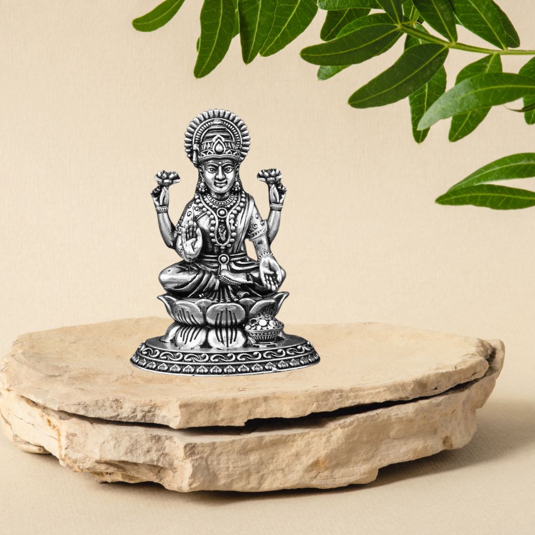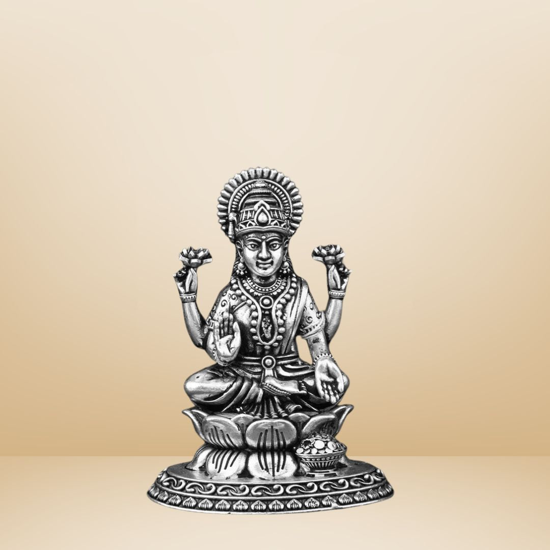 Invoke the divine blessings of wealth, fortune, and spiritual prosperity with this hand-sculpted silver idol of Goddess Lakshmi. Depicted in a classic seated pose on a blooming lotus, this idol is a sacred centerpiece during Diwali, Dhanteras, and Lakshmi Pooja. Crafted from 92.5 solid silver, it brings beauty and divinity to every pooja room.