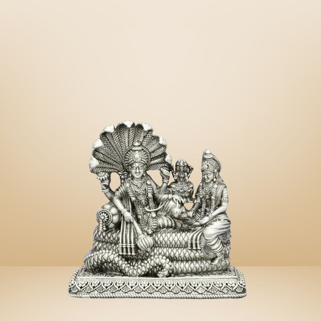 This divine depiction of Lord Vishnu resting on Sheshanaga with Goddess Lakshmi is a cherished symbol of cosmic balance and eternal protection. Worshipped widely during Vaikuntha Ekadashi and Satyanarayana Pooja, this 925 silver idol reflects devotion, prosperity, and timeless grace in your spiritual space.